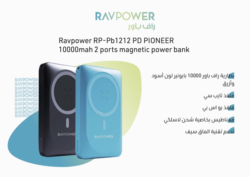 بطارية راف باور 10000 بايونير لون زرقمنفذ تايب سيمنفذ يو اس بيمغناطيس بخاصية شحن لاسلكيتدعم تقنية الماق سيف